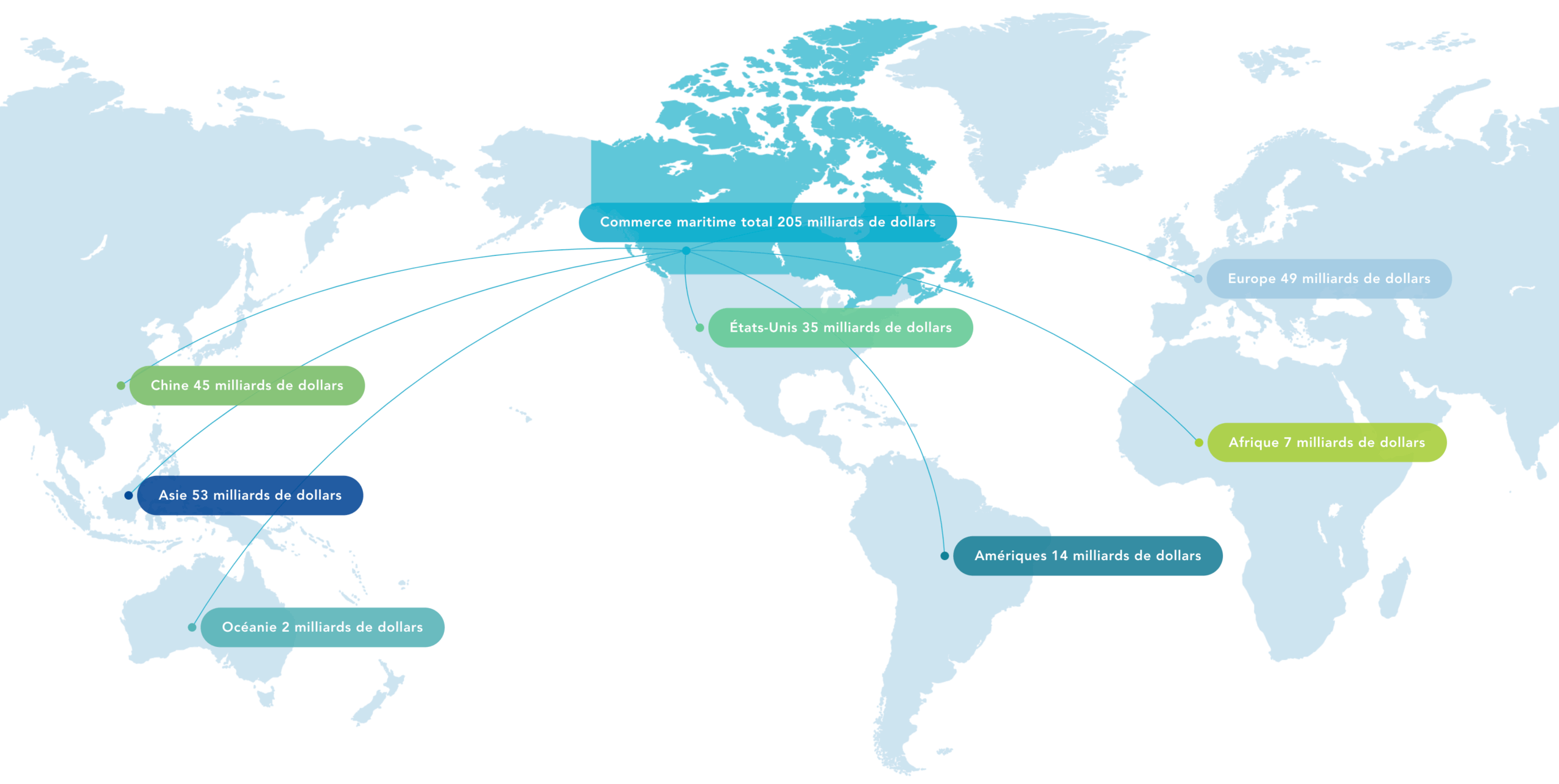 En 2015, le commerce maritime international du Canada totalisait 205 milliards de dollars. Sur ce montant, 93 milliards relevaient d’exportations et 112 milliards d’importations.