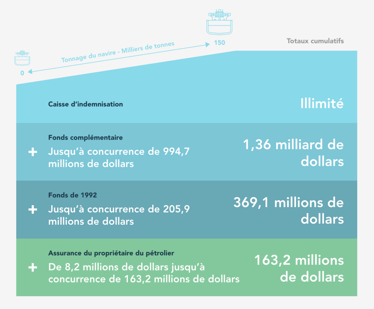 En cas de déversement d’hydrocarbures d’un pétrolier dans les eaux canadiennes, quatre sources de financement sont disponibles. En décembre 2018, le Fonds Navire a été modifié afin d’éliminer la limite de responsabilité par incident; en effet, il n’y maintenant plus de plafond à la compensation disponible en provenance du Fonds Navire.