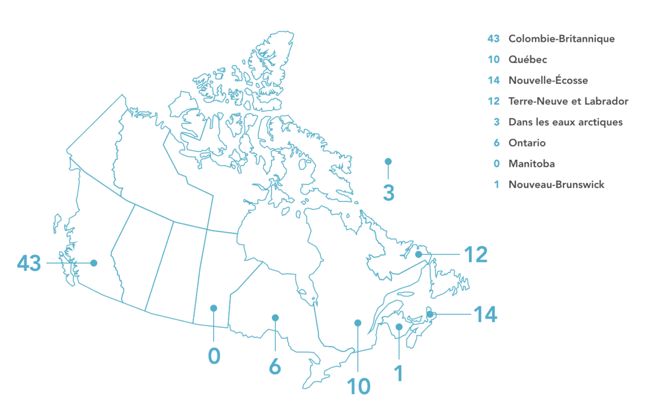 Ces incidents sont survenus à la suite de déversements et de fuites de divers types de navires, la plupart étant des navires abandonnés et dans un état délabré, y compris des bateaux de pêche, des paquebots de croisière, des embarcations de plaisance, des traversiers, des remorqueurs, des navires commerciaux et des barges, et de déversements d’origine inconnue.
